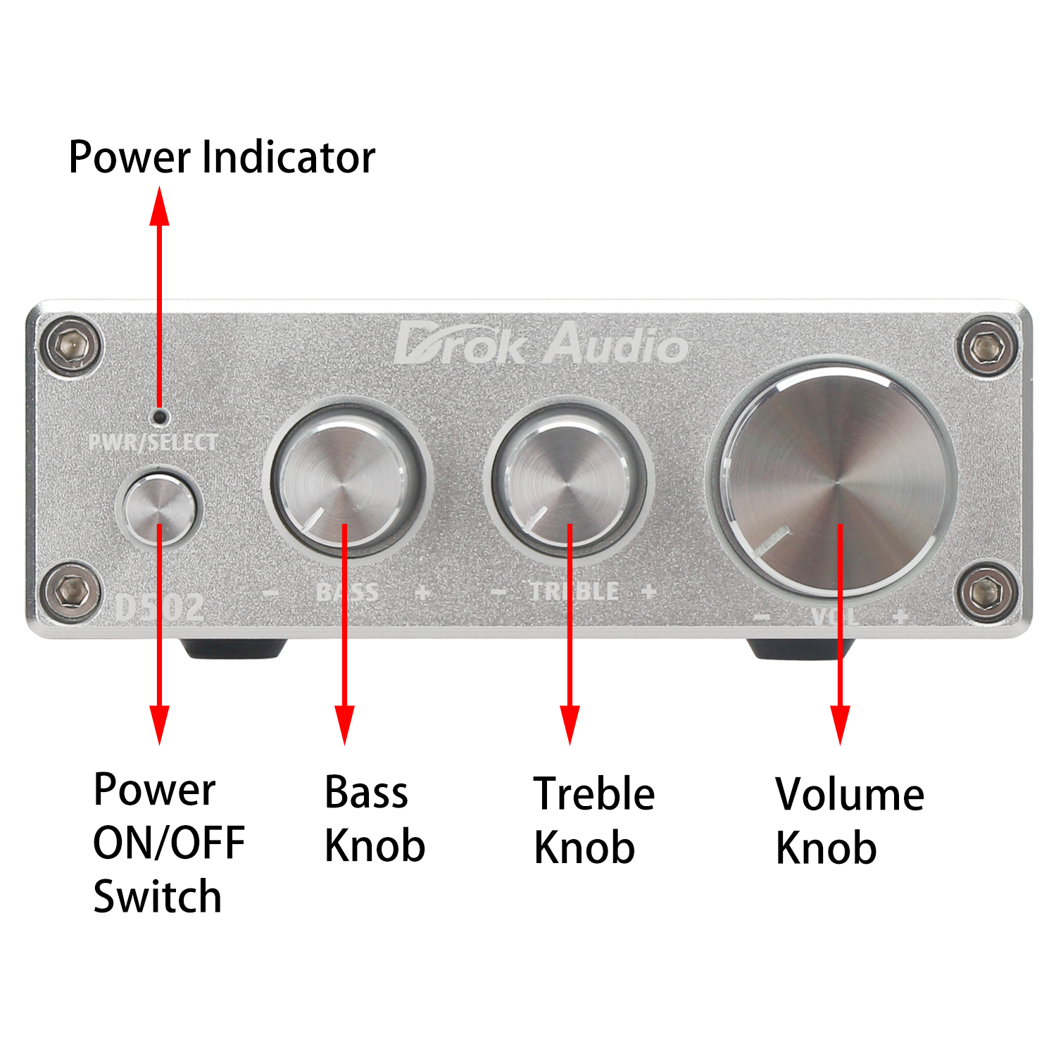 Treble knob: rotate clockwise to turn up the treble,  anti-clockwise to turn down the treble.