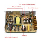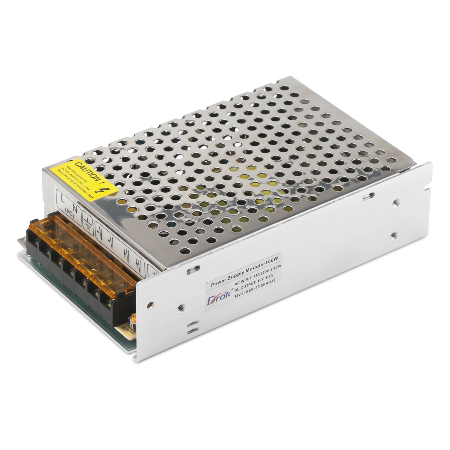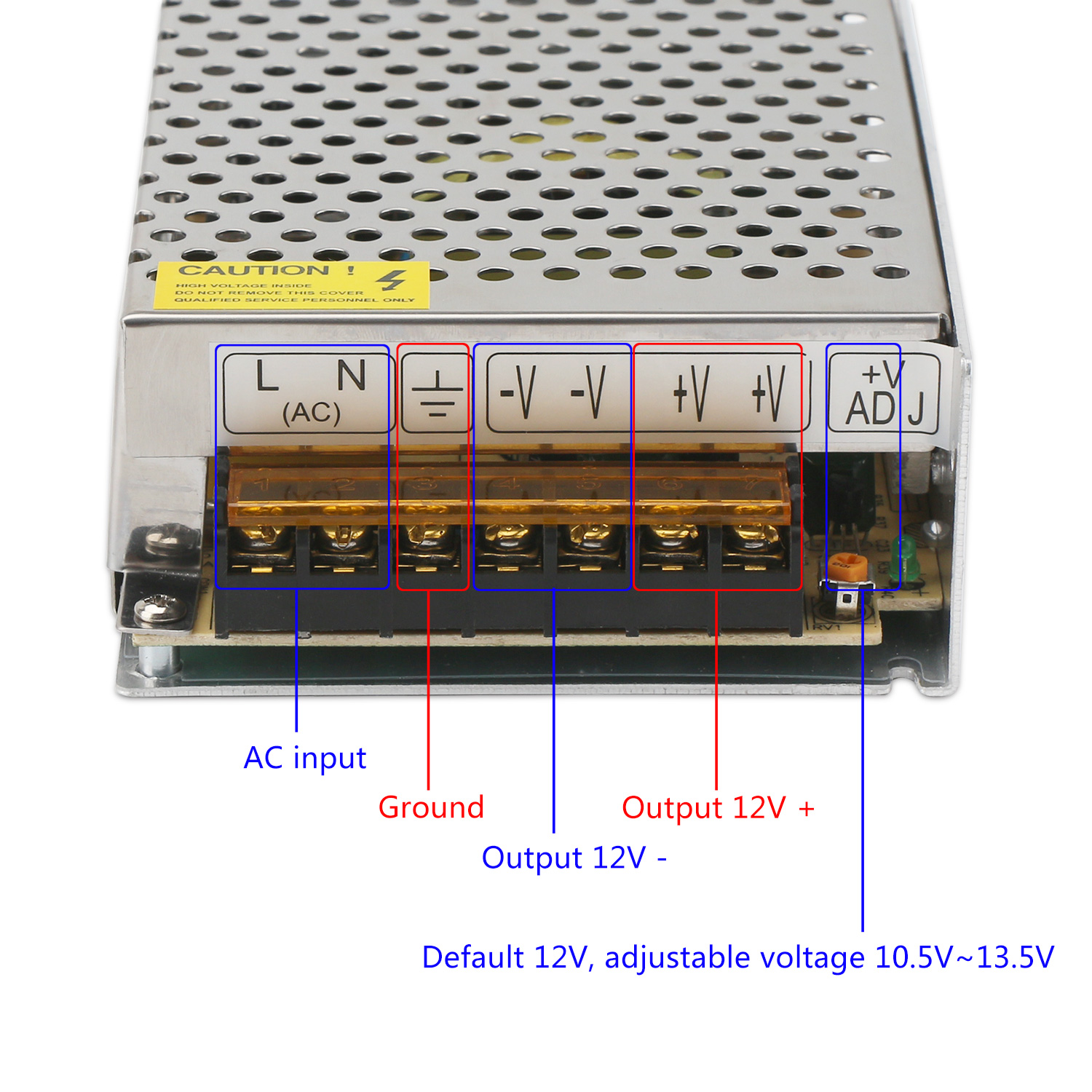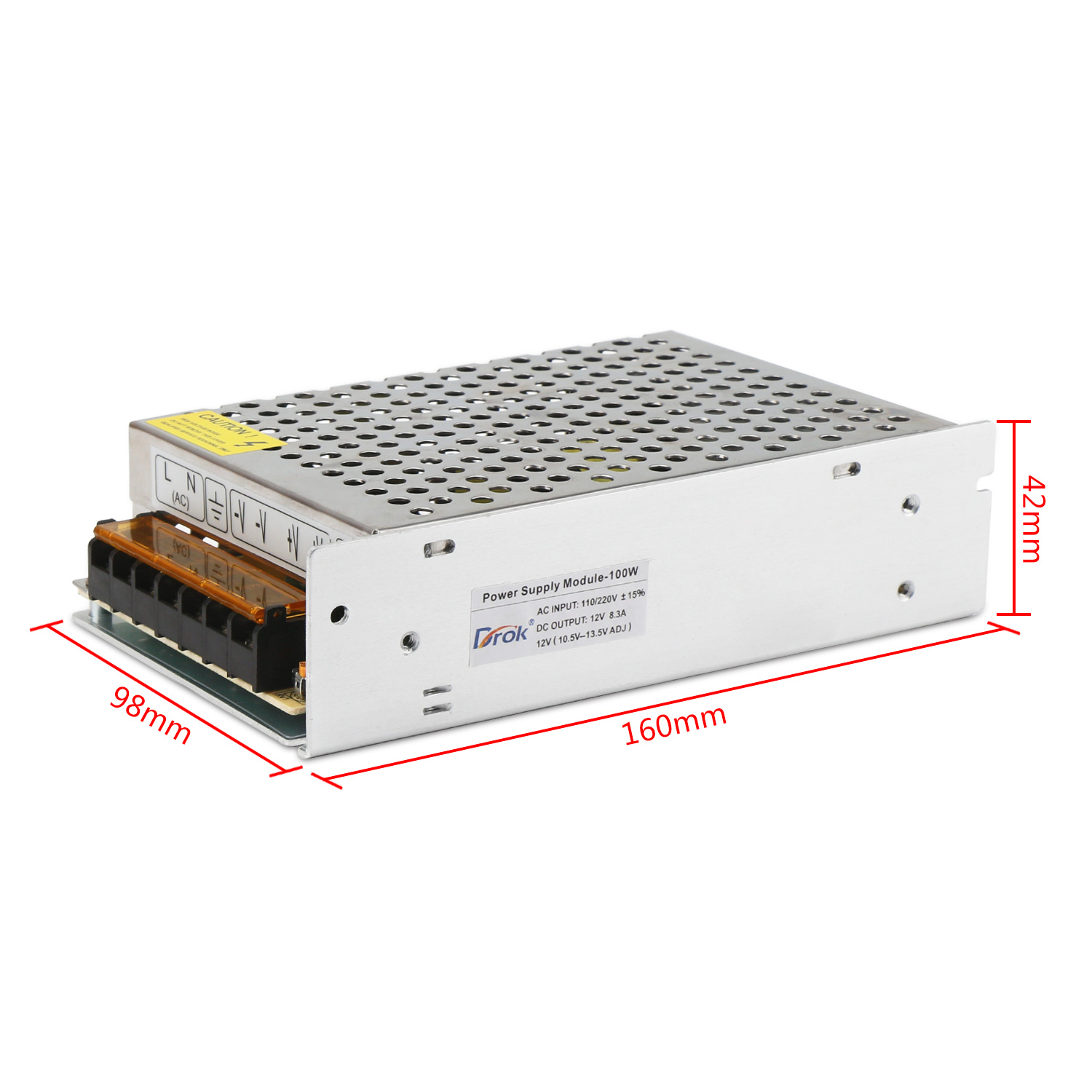 - Wide input range of AC110~220V, default output voltage is DC 12V, 8.3A and can be adjusted from 10.5-13.5V, output power is 100W.