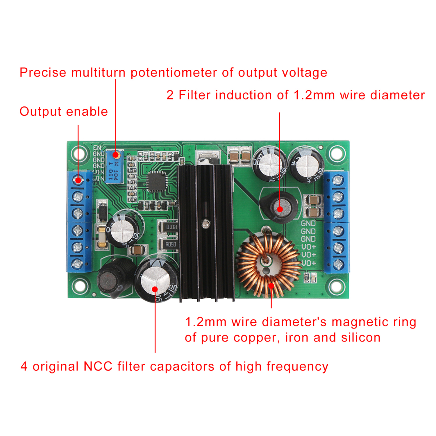 - Continuous Output Current: 12A, maximum 14A (input 14V, output 12V)