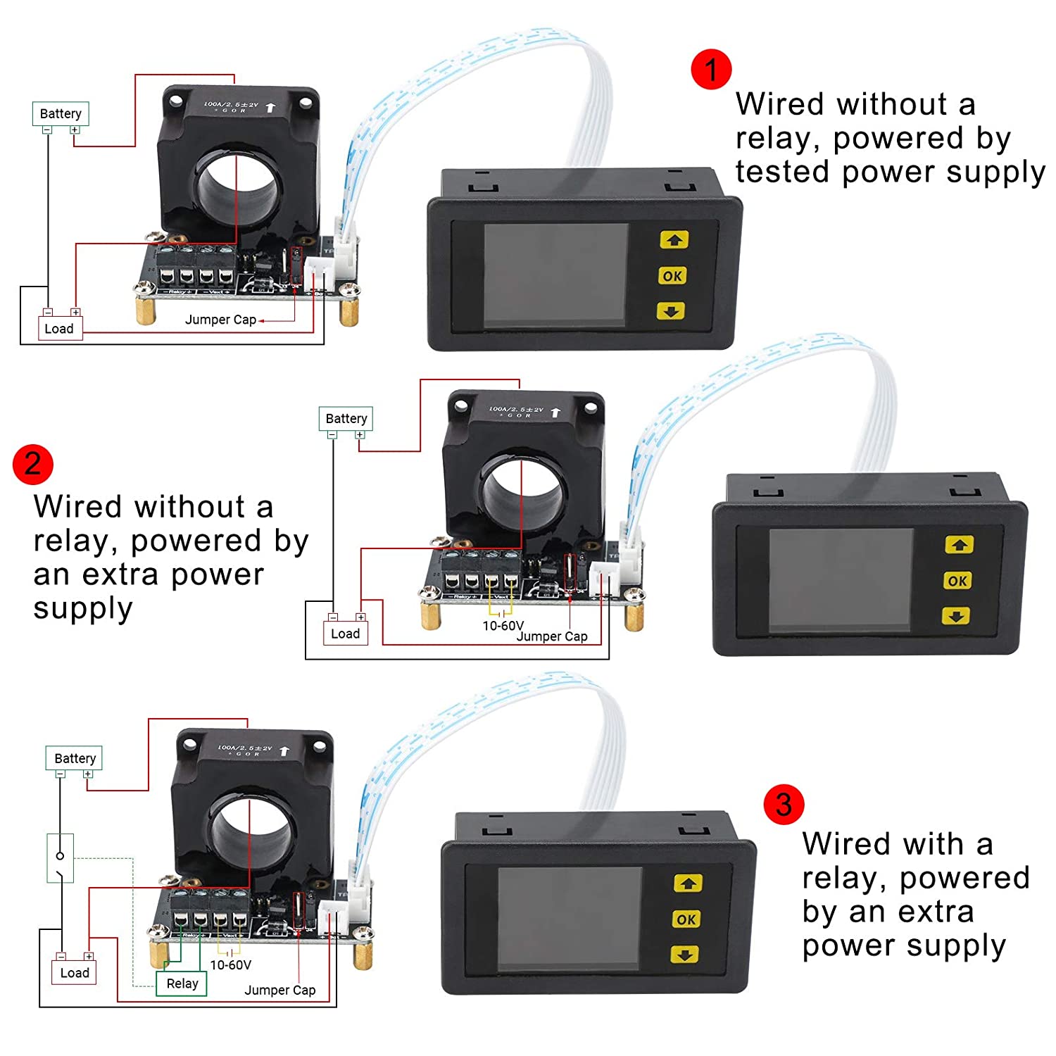 ButtonsIf the relay (this product doesn't contain a relay) is connected, press the button ↑ ↓ to move the yellow cursor to OUT after powering on, and press OK to control the output. If the OUT light turns green, the output will be turned on; if the OUT light is gray, the output will be turned off. If the relay is not used, the output is always on and the OUT light won't work. | Protection Function MenuOVP (Over-voltage protection): 0.01V-90V OCP(Over-current protection): 0.1-100A OPP(Over-power protection): 0.01W-9.99KW LOP(Low-voltage protection): 0.01V-90V OAH(Over-charge protection): 0.01AH-9999AH OFT(Over-time protection): 1min-99hour59min For details on how to set each protection, please check User Manual [PDF ] from Product guides and documents on this page. | Hall SensorPass the current wire through the round hole of the hall sensor, then the current will be detected. The current can be detected in both positive and negative directions. NOTE: Check the jumper connection, which needs to be connected on J4 when no external power supply for the hall sensor, while on J3 with an external power supply added to the hall sensor. | 2-meter Shield WireEquipped with a 2 meters shilded wire, which is a good option for those who need to work with a long distance. |