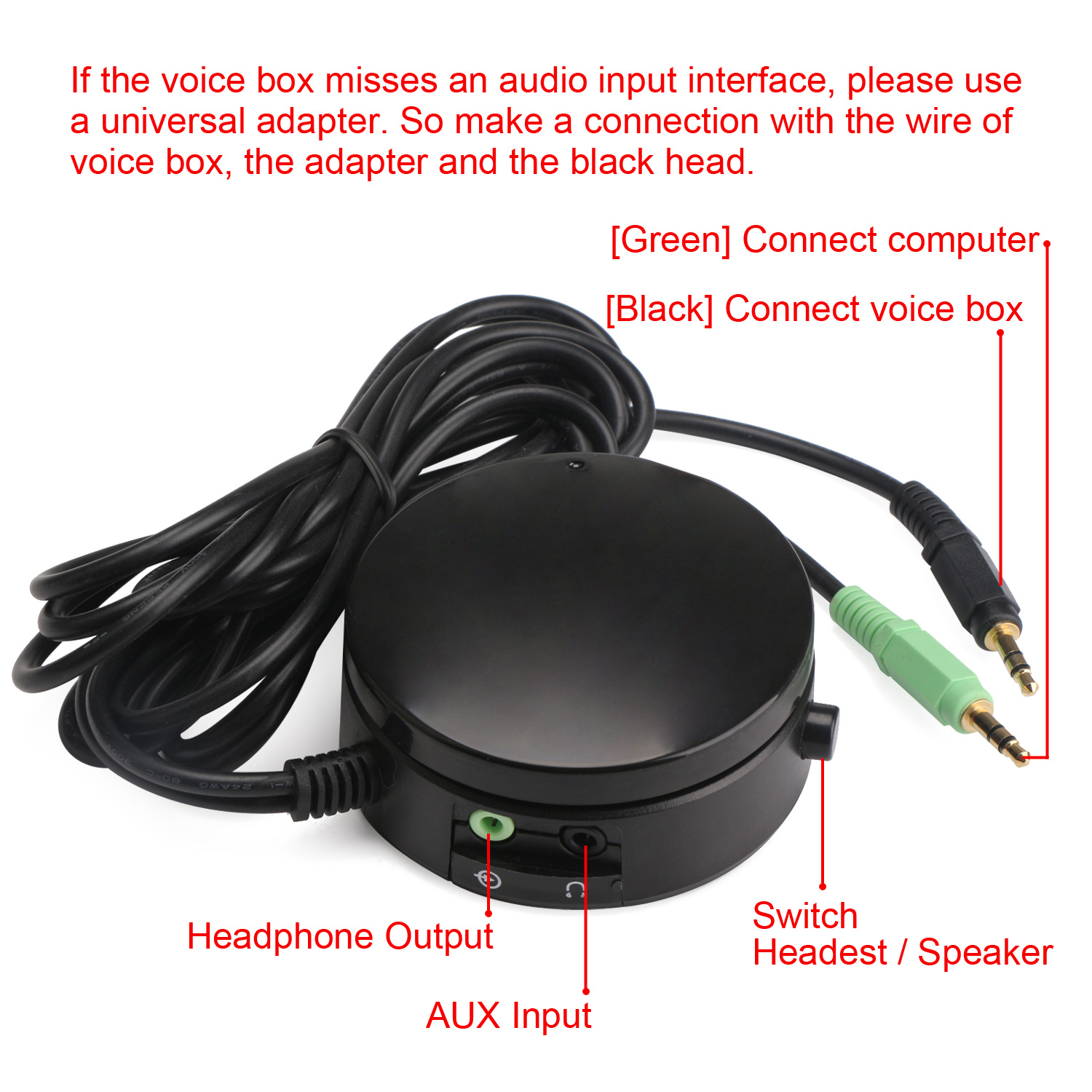 Connection:- Plug your headphones into a jack on the side of this audio switching, then the black cord connects to your speakers and the green one connects to your computer.