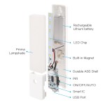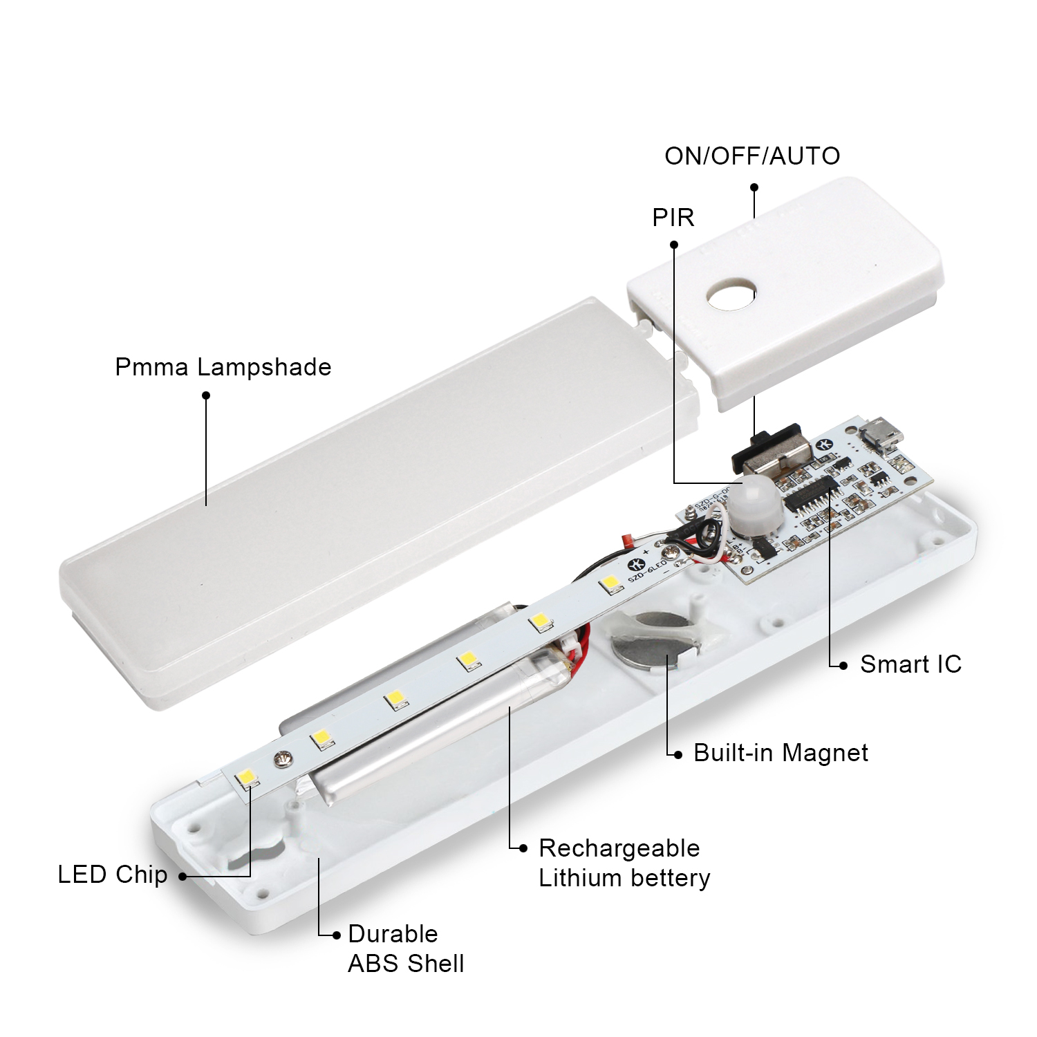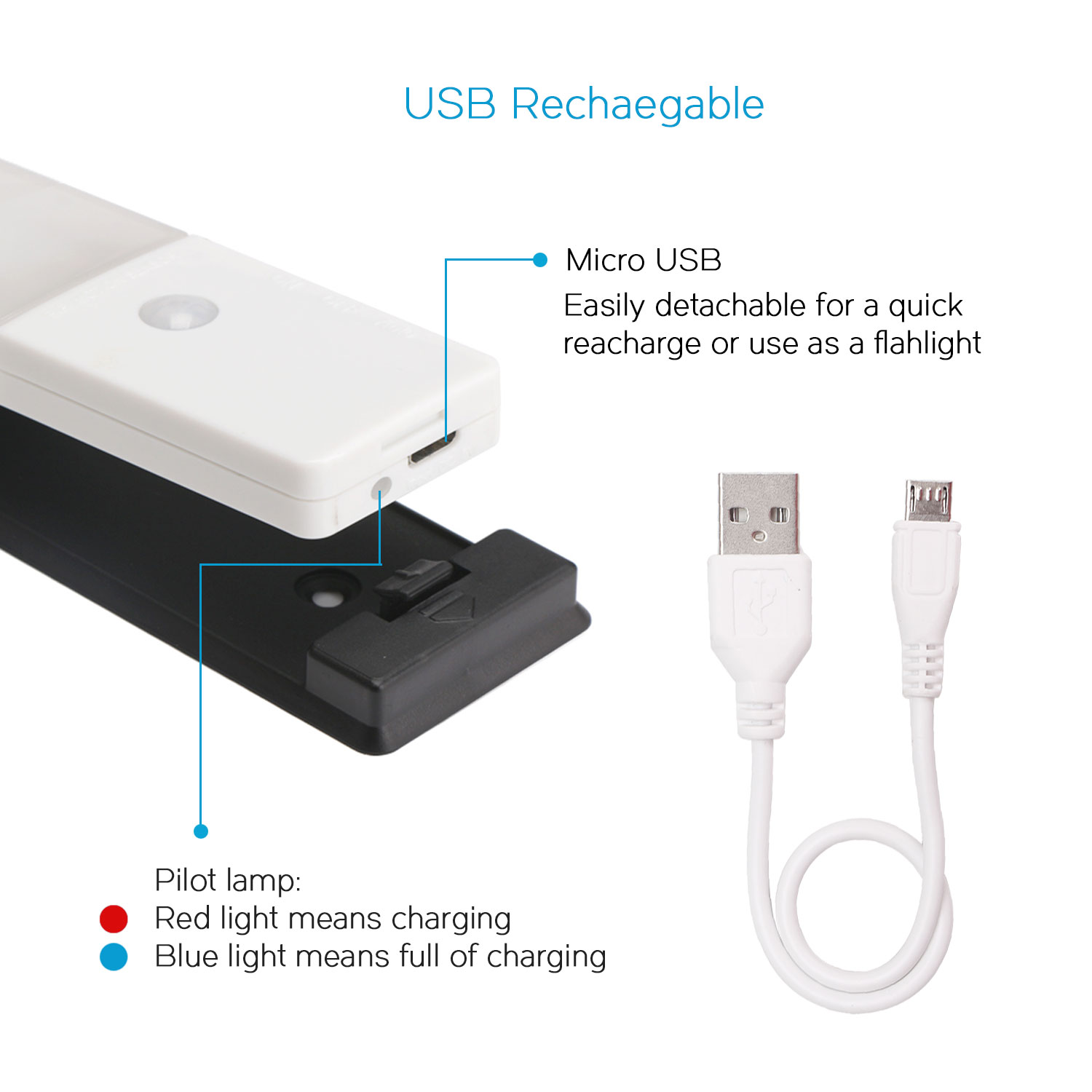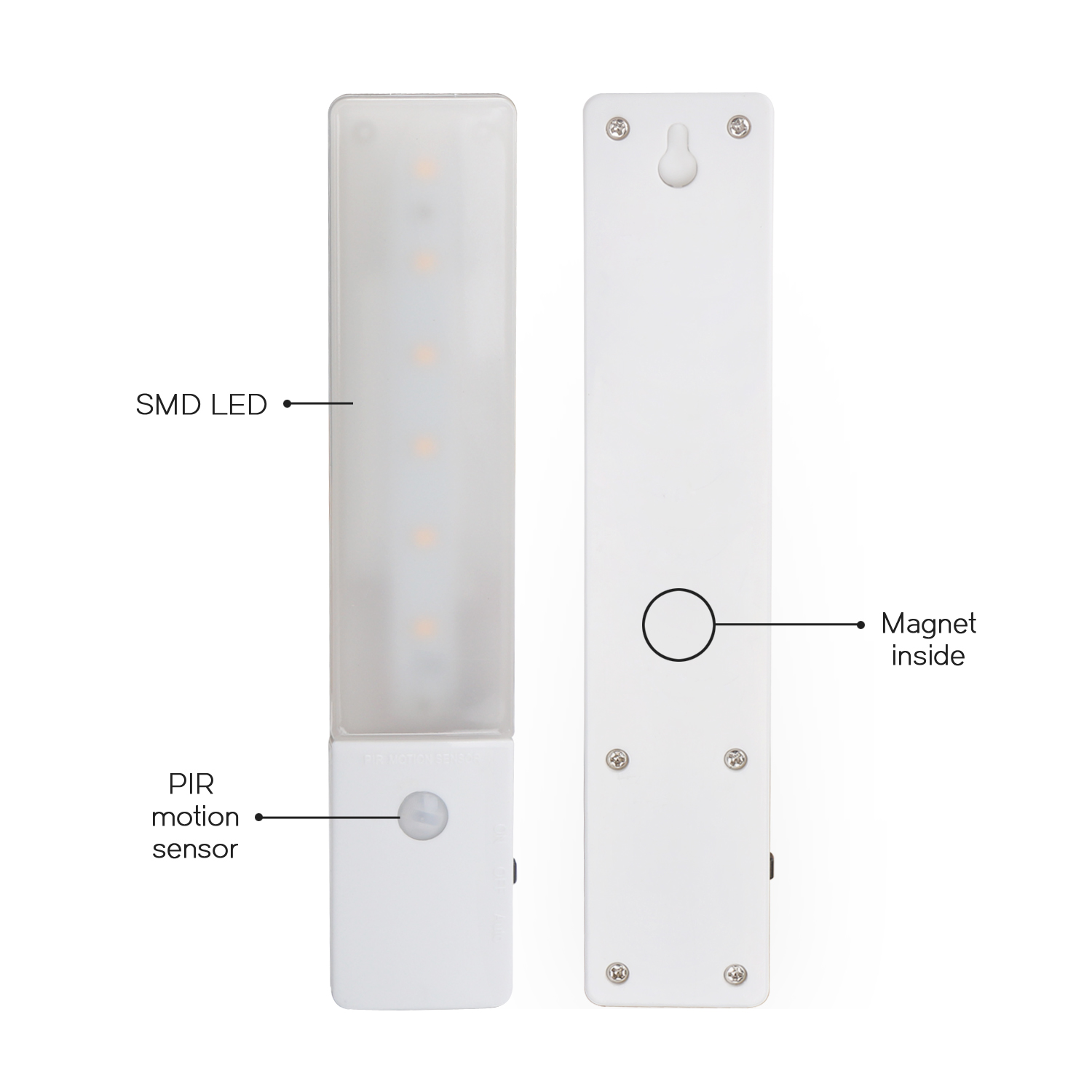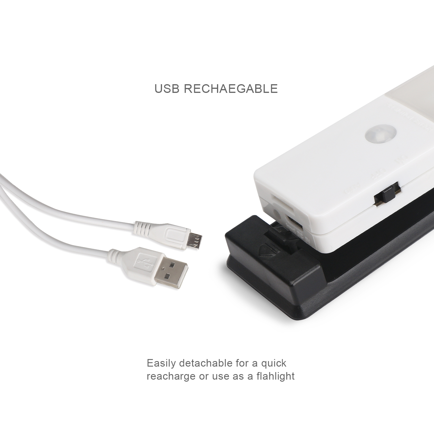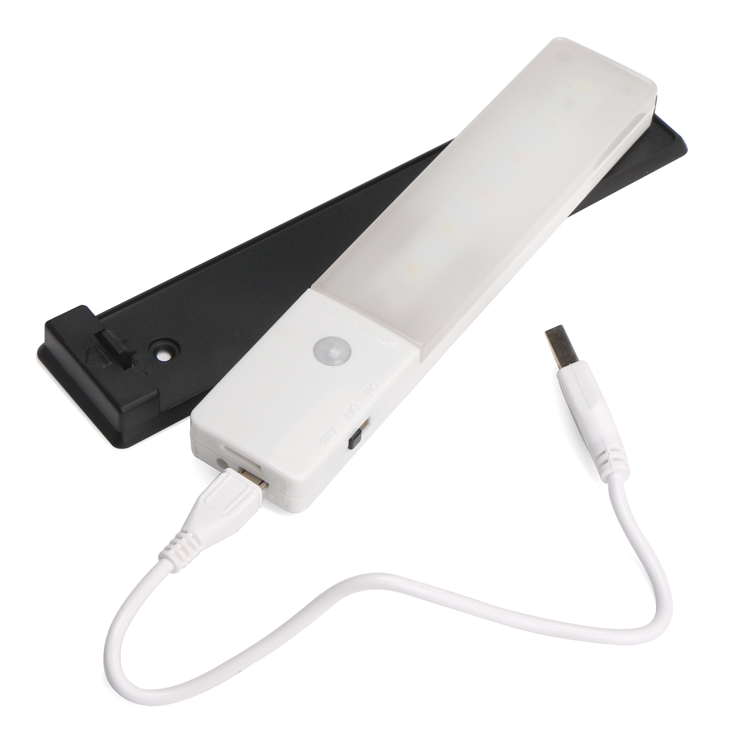It is a White Portable Night Light, Rechargeable Battery Capacity: 600mA, LED Life: more than 30,000 hours, Sensor Sensitivity Distance: 3 meters Maximum, Applications:Suitable for wardrobe, cupboard, wine cabinet, shoe box and etc. Also can be hung on wall as a night lamp and door lamp.