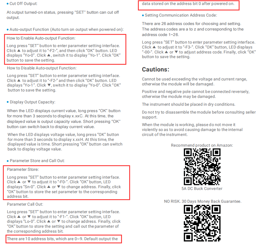 After setting voltage and current, please save setting data on address “0”, and enable auto-output function.