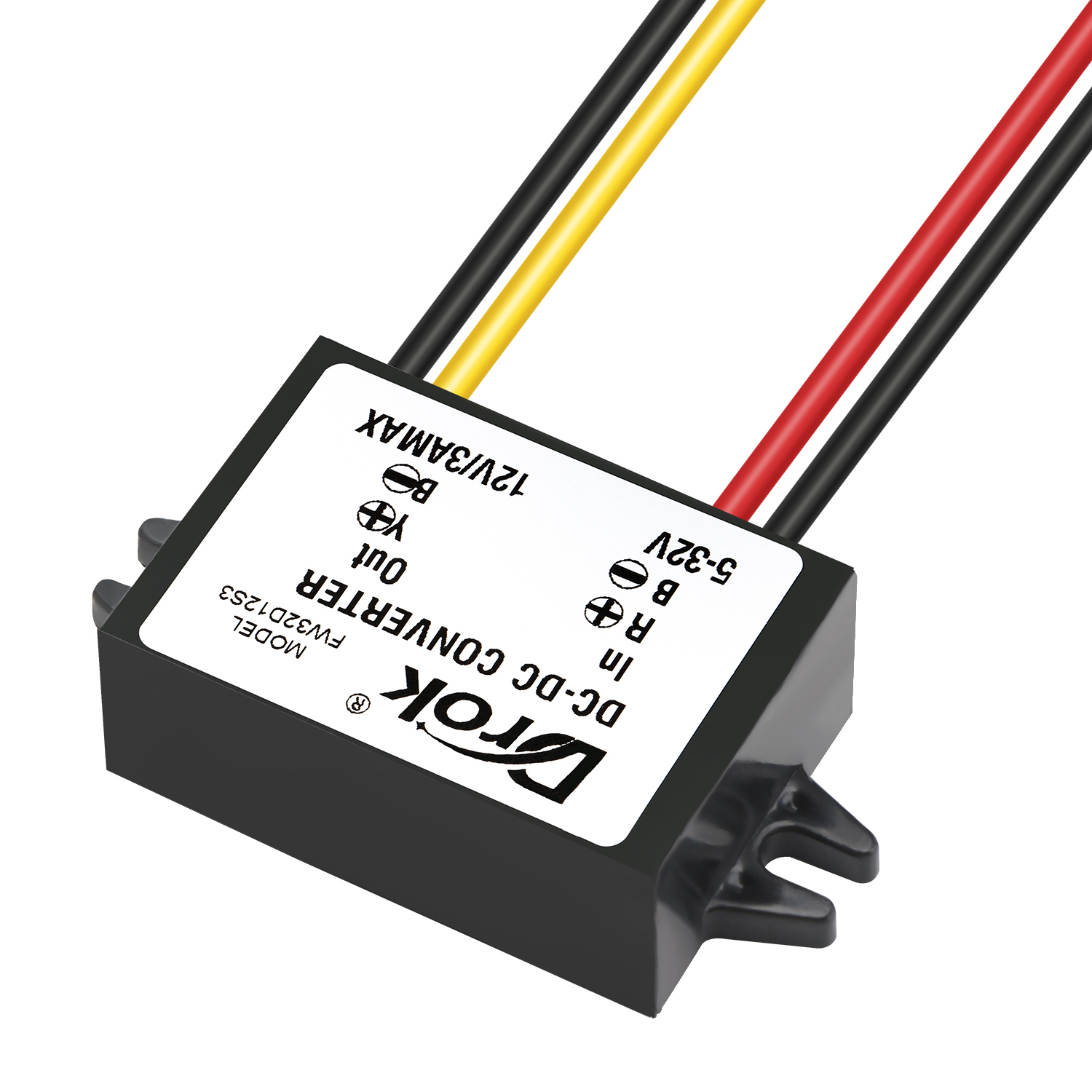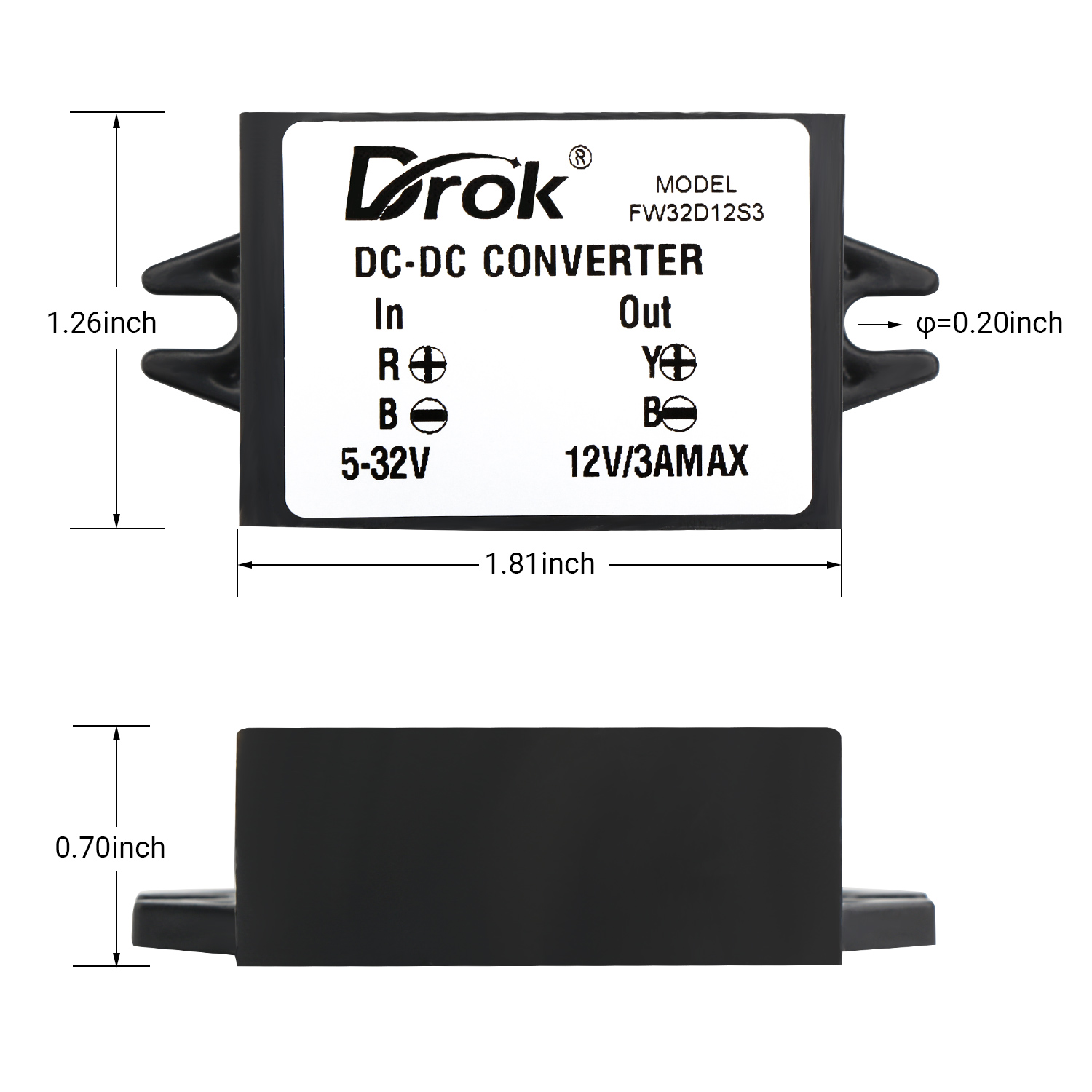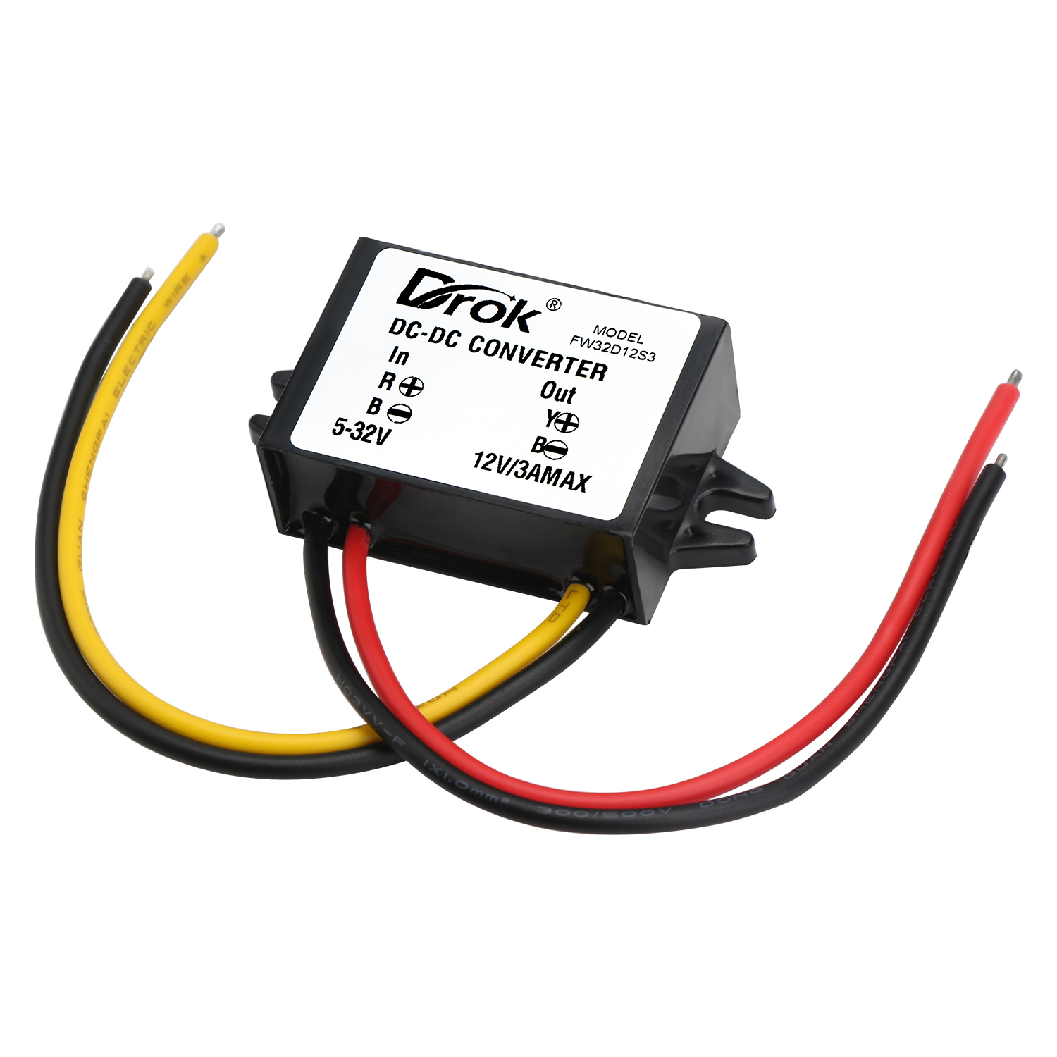1) PARAMETER --- DROK buck boost converter module input voltage is DC 5V~32V (12V/24V); output voltage is DC 12V; output current is 3A; output power is 36W.