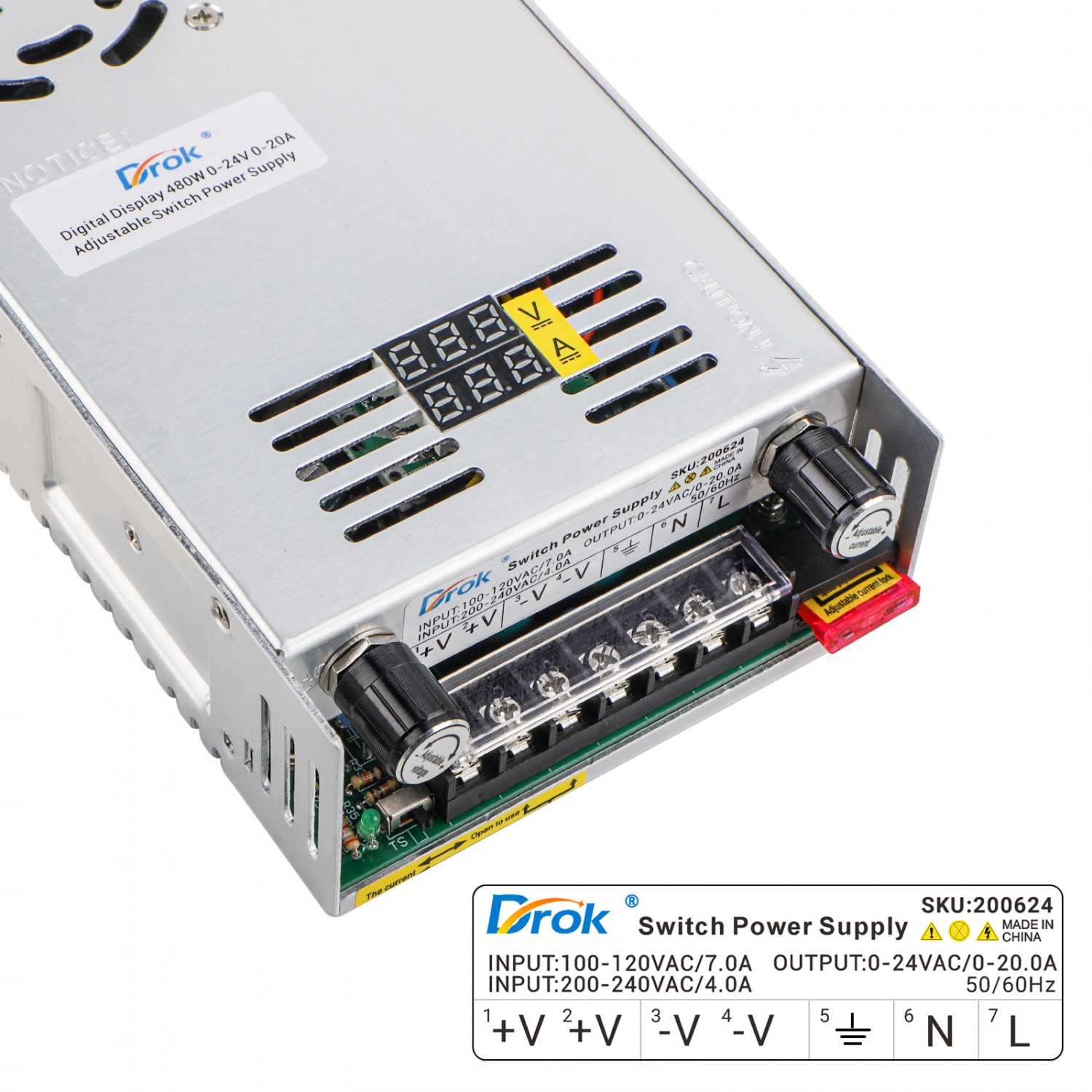 【Voltage and Current Adjustment】 Input Voltage can be 110V or 220V. Wide adjustable output Voltage range: DC 0-24V. Output current is also adjustable. Note——The maximum current is 20A. Make sure to use the devices which is below 20A.
