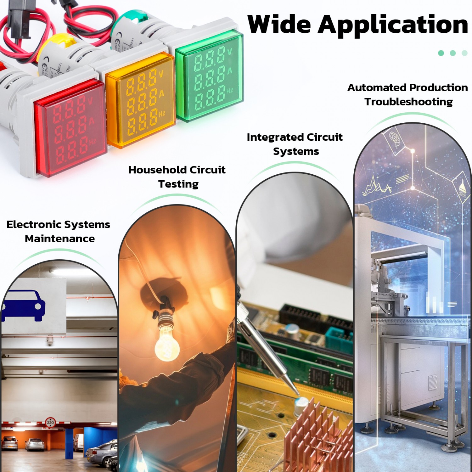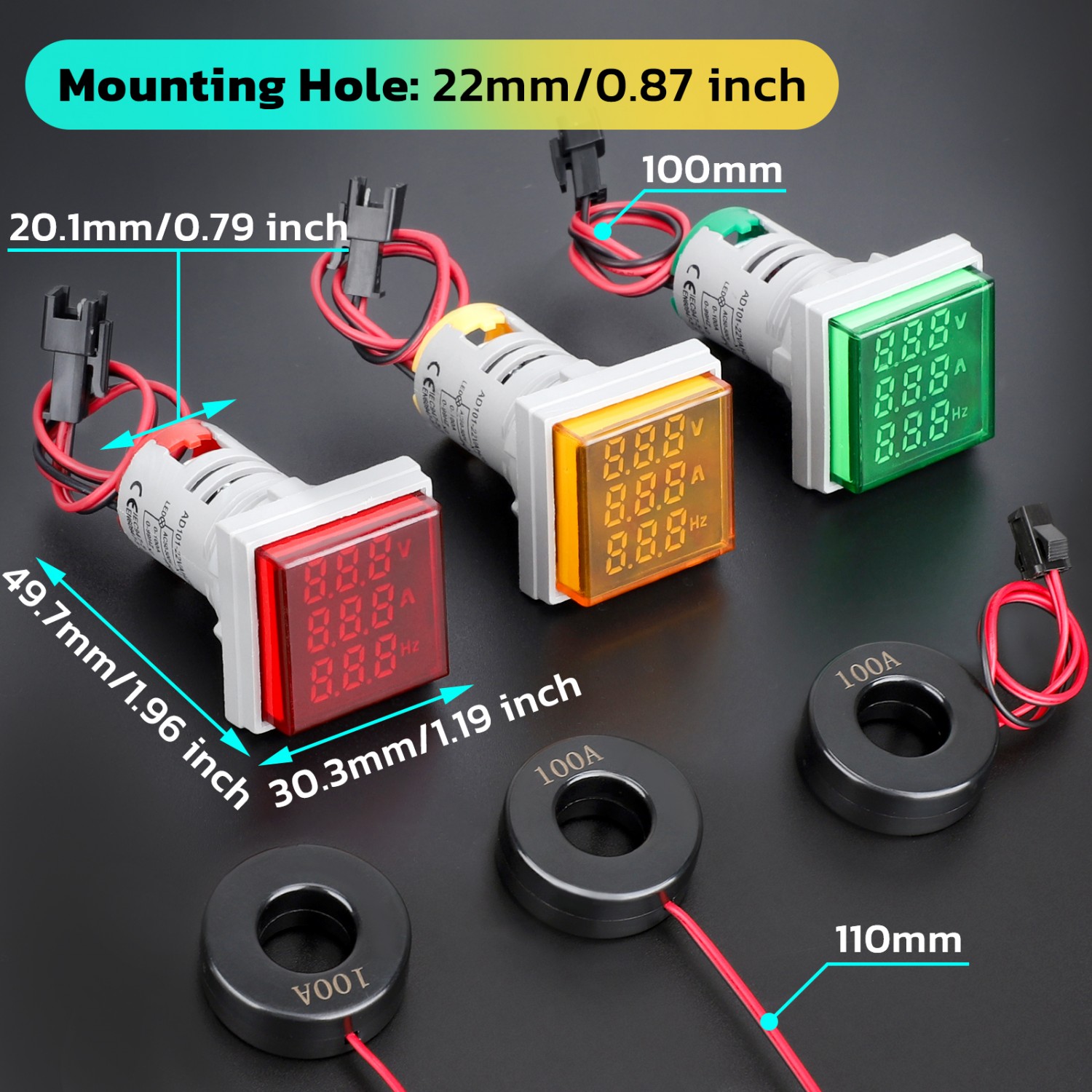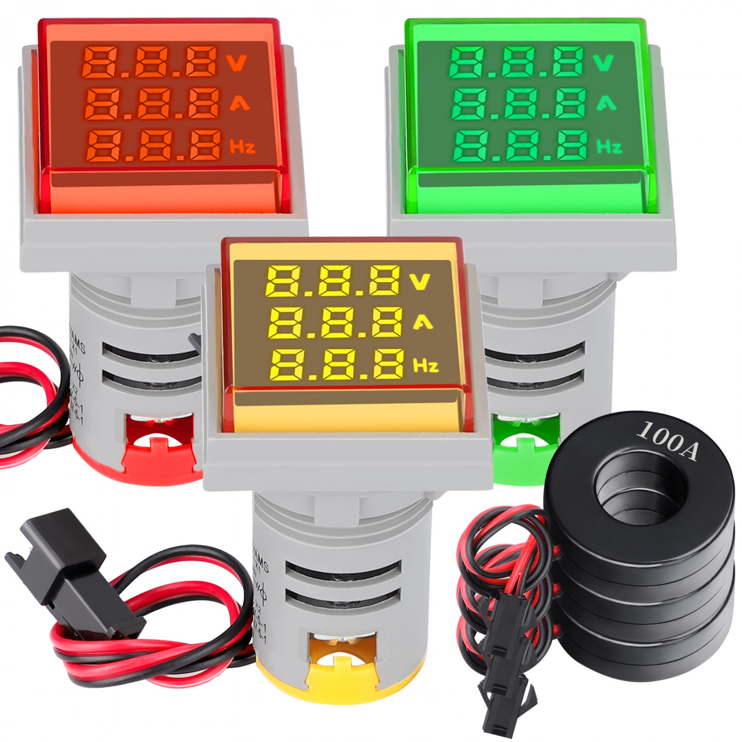 - 3 × AC Current and Voltage Display Meters (Red, Yellow & Green)