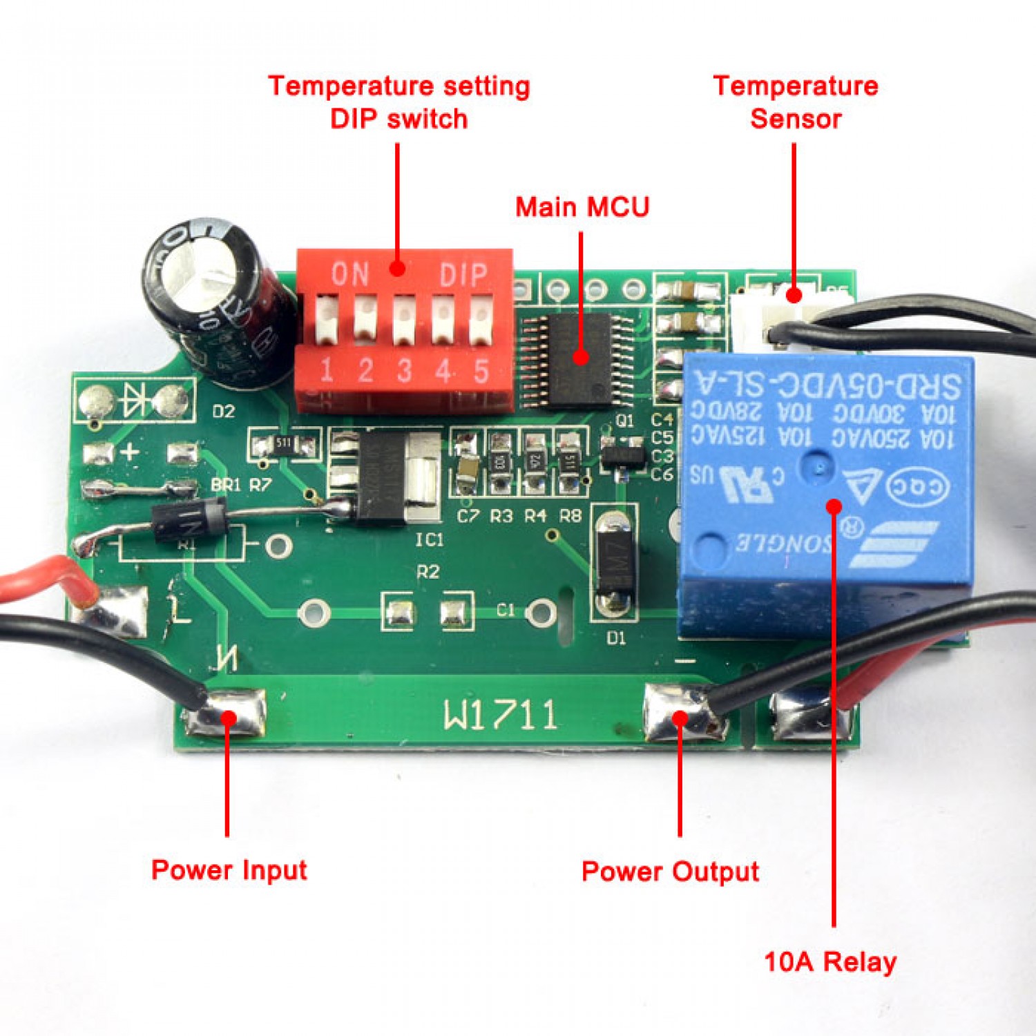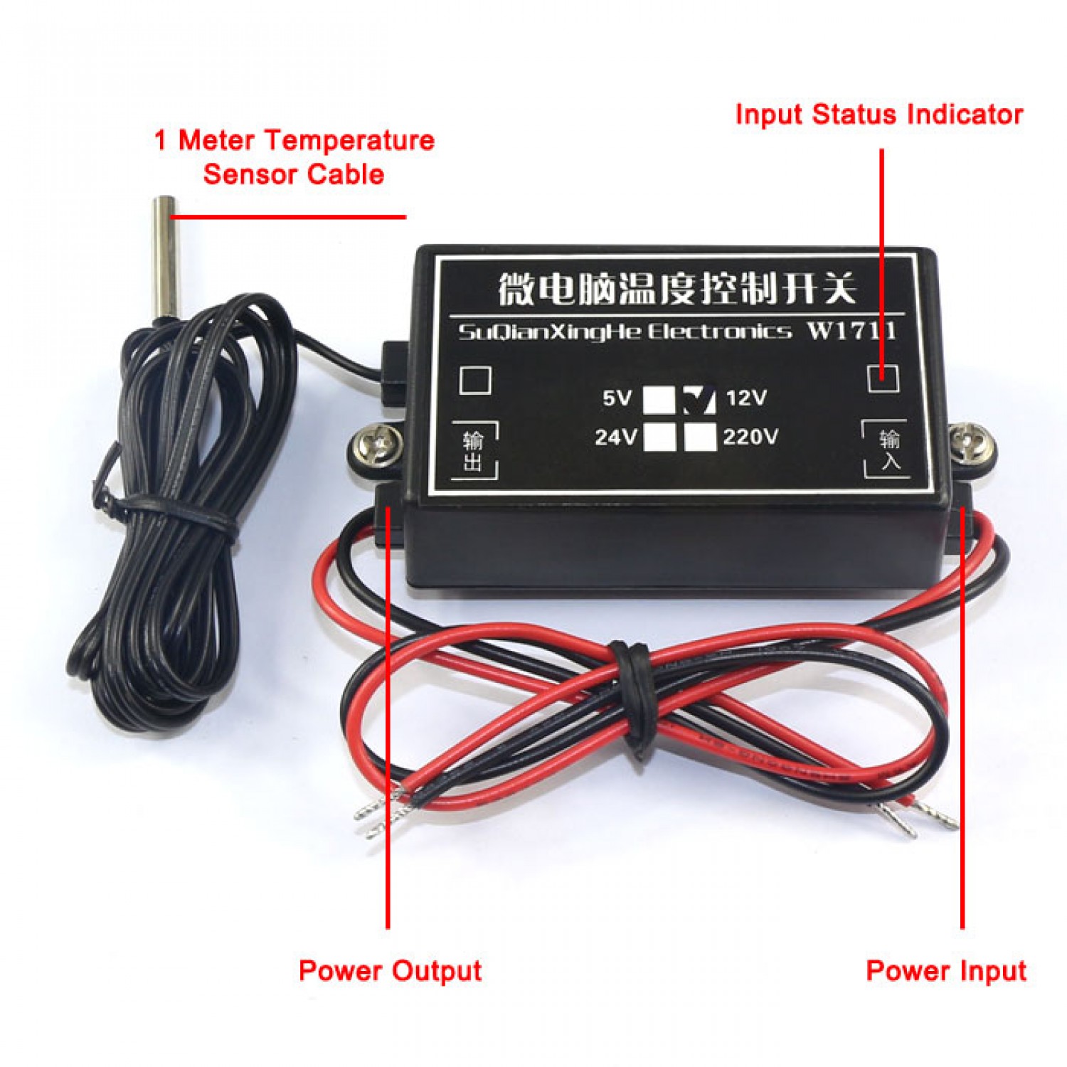 It's a Temperature Control Switch,Supply voltage: 12V,Output Capacitance: Max Current 5A, Max Power 1000W,Temperature range: -15-70 °c,Directly connected to the power at the input, the output connect to the load directly, such as heaters, light bulbs, fans, etc., the temperature probe connect to the place you want to control the temperature.